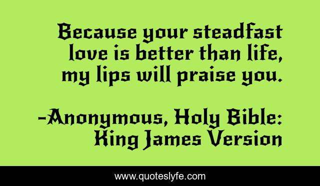 This page presents the quote "Because your steadfast love is better than life, my lips will praise you.". Author of this quote is Anonymous, Holy Bible: King James Version. This quote is about bible, god, jesus, 3, 63, psalm,.