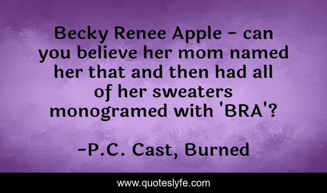 This page presents the quote "Becky Renee Apple - can you believe her mom named her that and then had all of her sweaters monogramed with 'BRA'?". Author of this quote is P.C. Cast, Burned. .