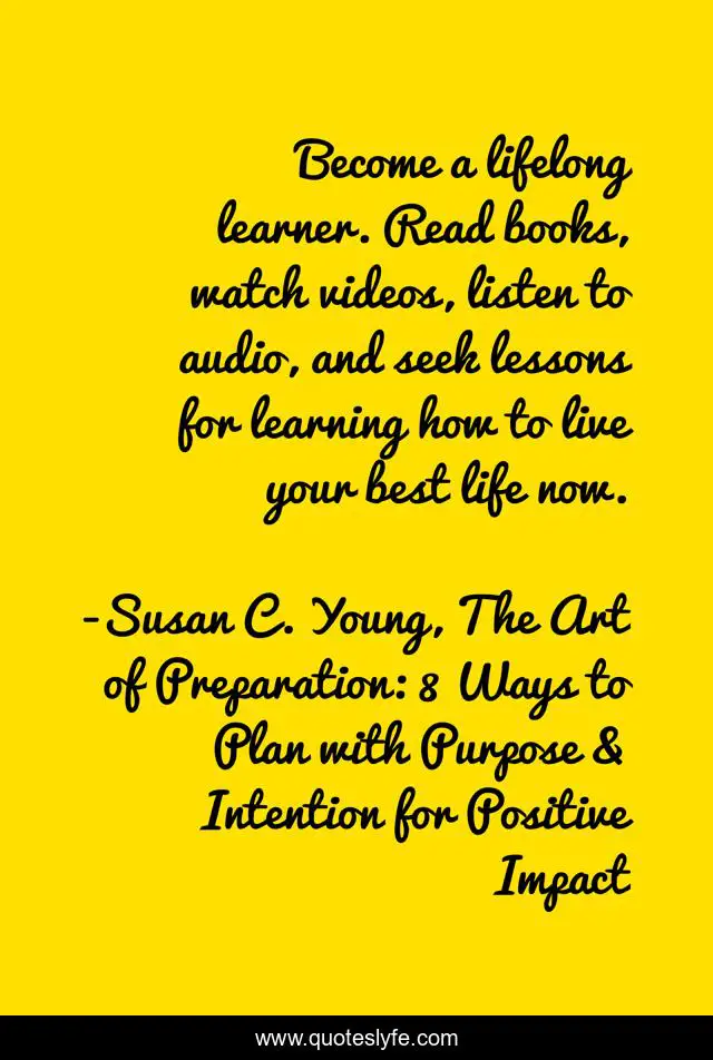 "Susan C. Young, The Art of Preparation: 8 Ways to Plan with Purpose & Intention for Positive Impact Quotes." Quoteslyfe.com, 2025. Tue. 09 Dec. 2025. <https://www.quoteslyfe.com/quote/Become-a-lifelong-learner-Read-books-watch-227509>.