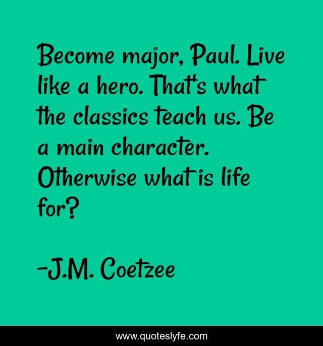 This page presents the quote "Become major, Paul. Live like a hero. That's what the classics teach us. Be a main character. Otherwise what is life for?". Author of this quote is J.M. Coetzee. This quote is about heroism, courage, live-life,.