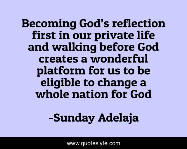 This page presents the quote "Becoming God’s reflection first in our private life and walking before God creates a wonderful platform for us to be eligible to change a whole nation for God". Author of this quote is Sunday Adelaja. This quote is about walking, reflection, eligible, god, private, nation, platform, wonderful, change,.
