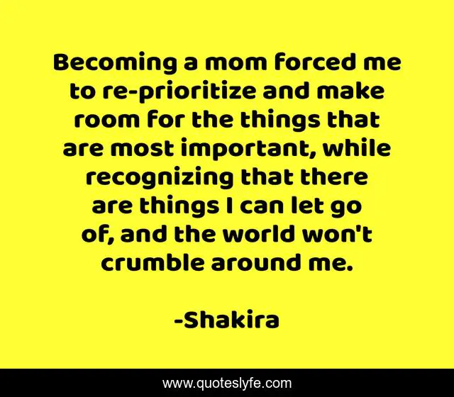 This page presents the quote "Becoming a mom forced me to re-prioritize and make room for the things that are most important, while recognizing that there are things I can let go of, and the world won't crumble around me.". Author of this quote is Shakira. This quote is about me, world, important,.