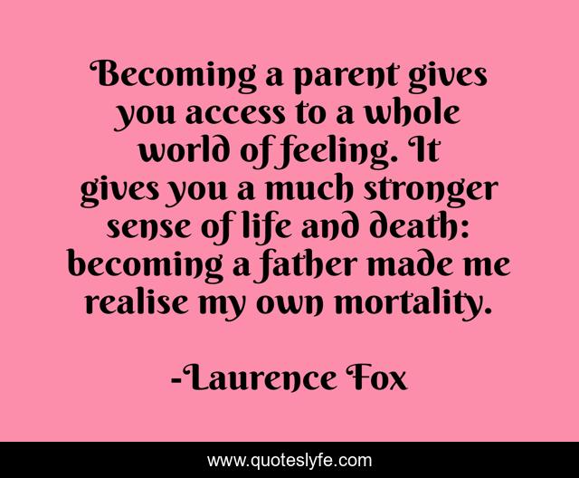 This page presents the quote "Becoming a parent gives you access to a whole world of feeling. It gives you a much stronger sense of life and death: becoming a father made me realise my own mortality.". Author of this quote is Laurence Fox. This quote is about world, life, father,.