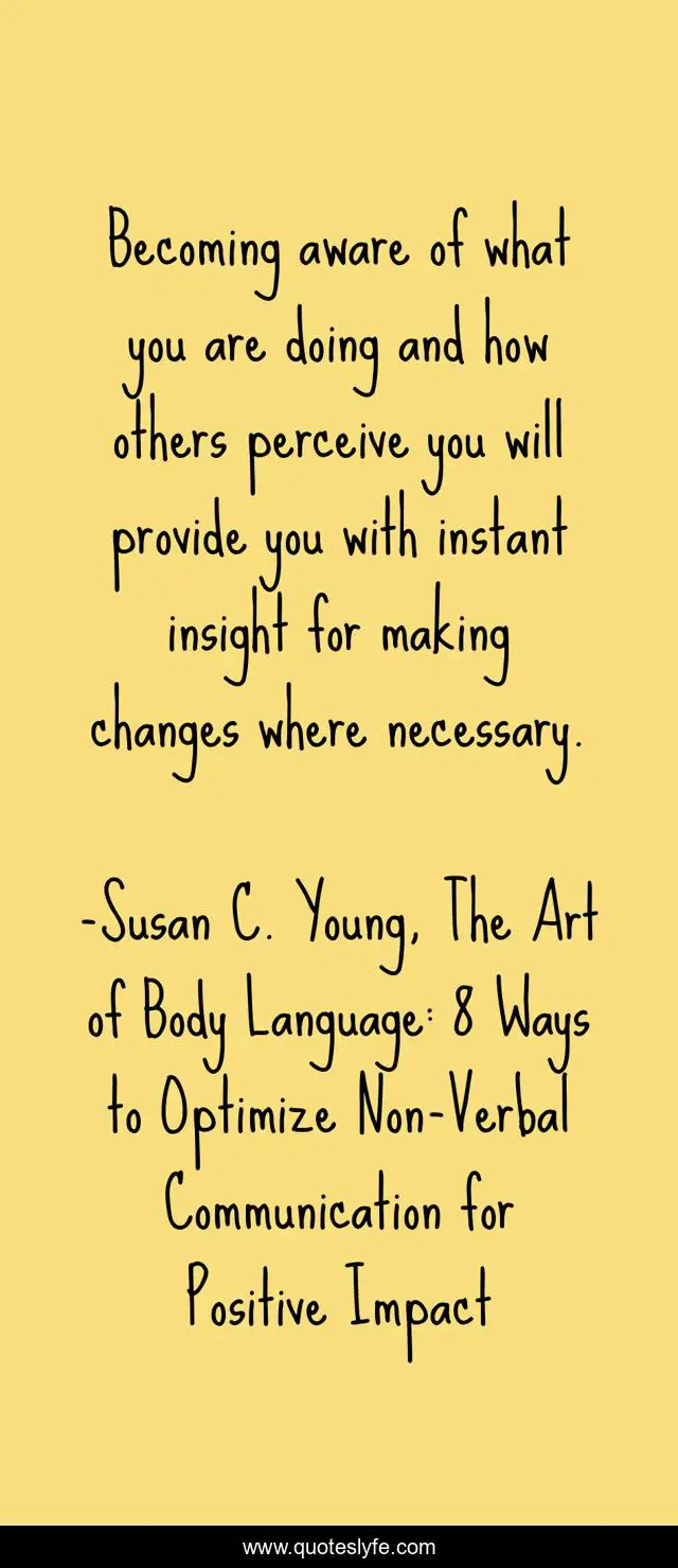 "Susan C. Young, The Art of Body Language: 8 Ways to Optimize Non-Verbal Communication for Positive Impact Quotes." Quoteslyfe.com, 2025. Fri. 05 Dec. 2025. <https://www.quoteslyfe.com/quote/Becoming-aware-of-what-you-are-doing-233522>.