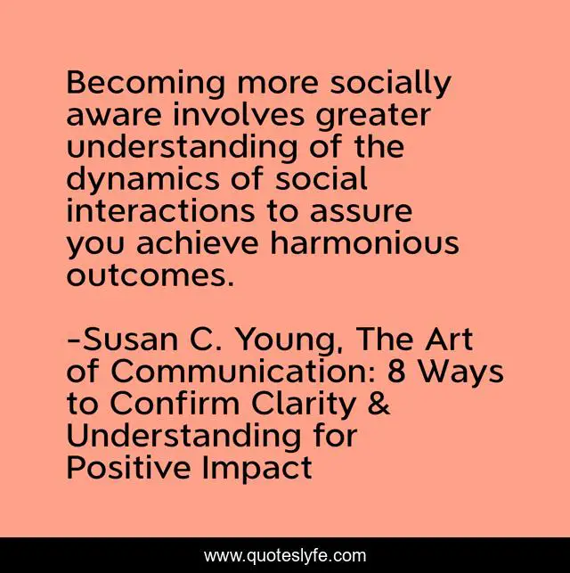 "Susan C. Young, The Art of Communication: 8 Ways to Confirm Clarity & Understanding for Positive Impact Quotes." Quoteslyfe.com, 2025. Fri. 05 Dec. 2025. <https://www.quoteslyfe.com/quote/Becoming-more-socially-aware-involves-greater-understanding-233449>.