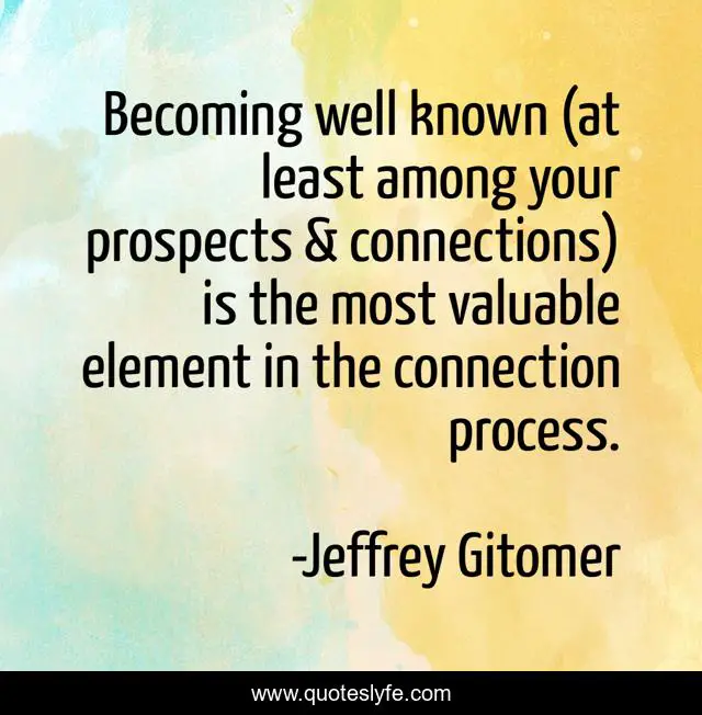 This page presents the quote "Becoming well known (at least among your prospects & connections) is the most valuable element in the connection process.". Author of this quote is Jeffrey Gitomer. This quote is about jeffrey-gitomer, selling, networking, success, sales, gitomer,.