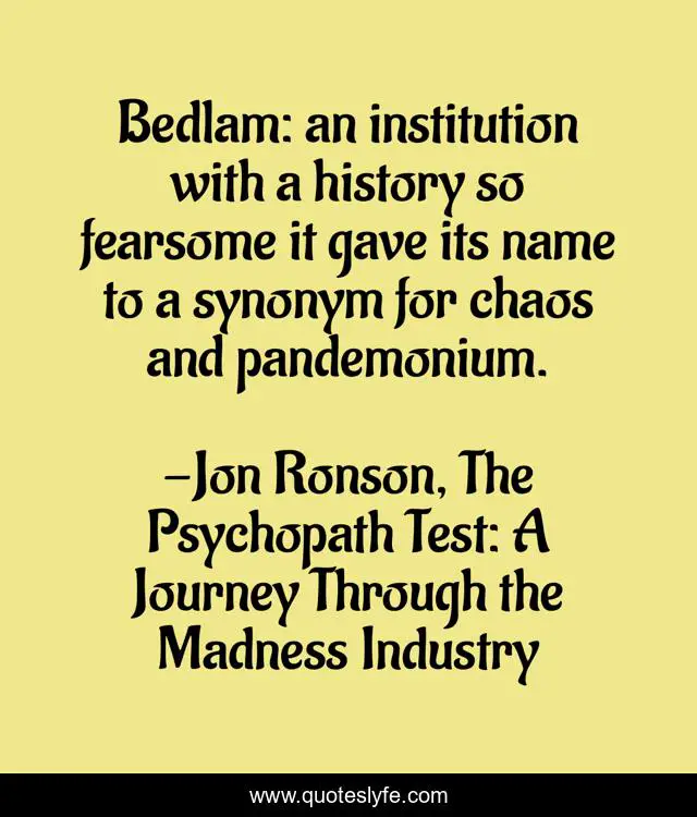 This page presents the quote "Bedlam: an institution with a history so fearsome it gave its name to a synonym for chaos and pandemonium.". Author of this quote is Jon Ronson, The Psychopath Test: A Journey Through the Madness Industry. This quote is about bedlam, madness, institution,.