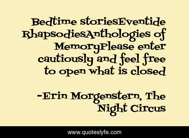 "Erin Morgenstern, The Night Circus Quotes." Quoteslyfe.com, 2025. Sat. 06 Dec. 2025. <https://www.quoteslyfe.com/quote/Bedtime-storiesEventide-RhapsodiesAnthologies-of-MemoryPlease-enter-cautiously-180569>.