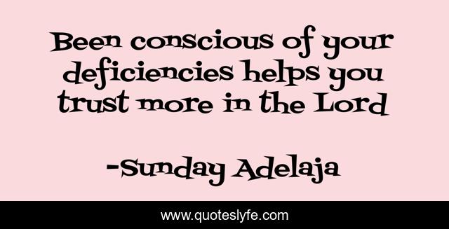 This page presents the quote "Been conscious of your deficiencies helps you trust more in the Lord". Author of this quote is Sunday Adelaja. This quote is about consciousness, calling, deficiency, purpose, lord, trust, fulfillment,.