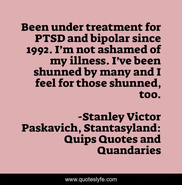 This page presents the quote "Been under treatment for PTSD and bipolar since 1992. I’m not ashamed of my illness. I’ve been shunned by many and I feel for those shunned, too.". Author of this quote is Stanley Victor Paskavich, Stantasyland: Quips Quotes and Quandaries. This quote is about psychology, mental-health-stigma, discrimination, bipolar-ptsd, bipolar, prejudice, disabled-veterans, ptsd, mental-illness,.