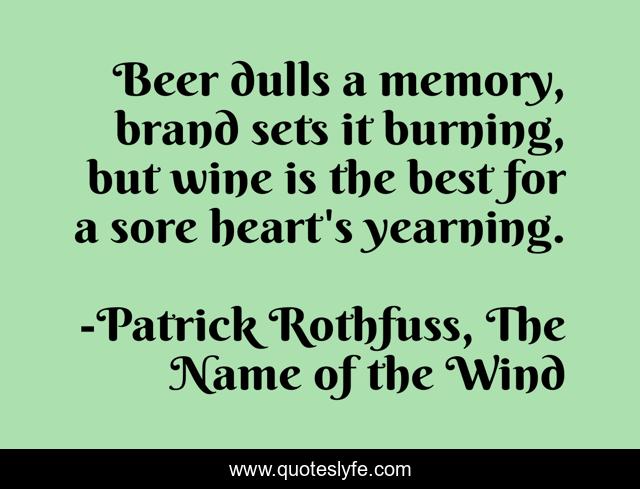 This page presents the quote "Beer dulls a memory, brand sets it burning, but wine is the best for a sore heart's yearning.". Author of this quote is Patrick Rothfuss, The Name of the Wind. .
