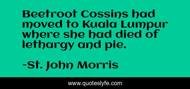 This page presents the quote "Beetroot Cossins had moved to Kuala Lumpur where she had died of lethargy and pie.". Author of this quote is St. John Morris. This quote is about surreal, non-sequitur, comedy, satire, humour,.