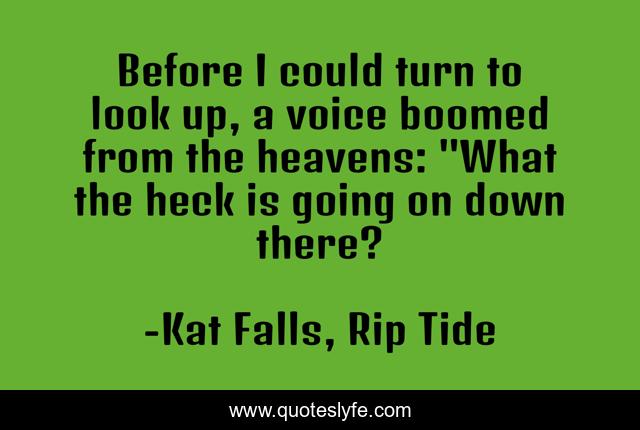 This page presents the quote "Before I could turn to look up, a voice boomed from the heavens: "What the heck is going on down there?". Author of this quote is Kat Falls, Rip Tide. This quote is about humor, ty, god, gemma, megaphone, mayor-fife,.