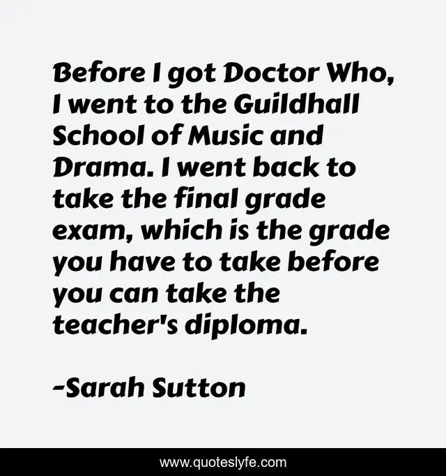 This page presents the quote "Before I got Doctor Who, I went to the Guildhall School of Music and Drama. I went back to take the final grade exam, which is the grade you have to take before you can take the teacher's diploma.". Author of this quote is Sarah Sutton. This quote is about school, music, doctor,.