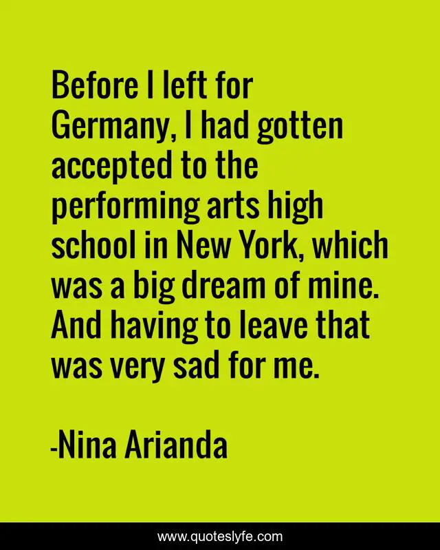 This page presents the quote "Before I left for Germany, I had gotten accepted to the performing arts high school in New York, which was a big dream of mine. And having to leave that was very sad for me.". Author of this quote is Nina Arianda. This quote is about me, school, high school,.