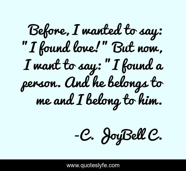This page presents the quote "Before, I wanted to say: "I found love!" But now, I want to say: "I found a person. And he belongs to me and I belong to him.". Author of this quote is C. JoyBell C.. This quote is about belonging, love, inspirational, learning-the-truth, people, belong, life-and-learning, person, inspirational-love,.