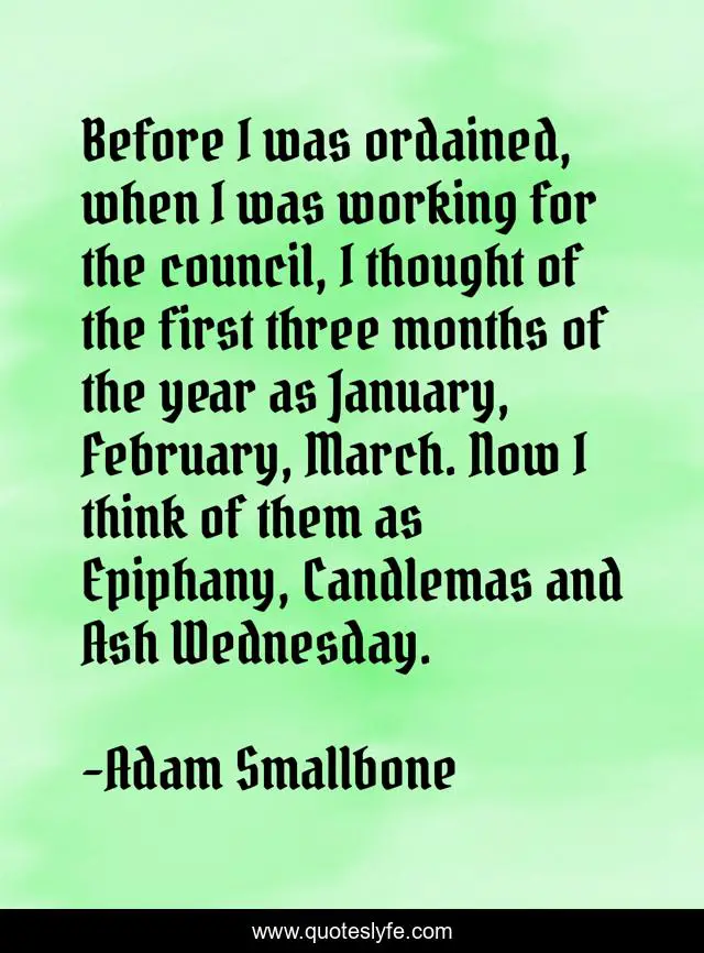 This page presents the quote "Before I was ordained, when I was working for the council, I thought of the first three months of the year as January, February, March. Now I think of them as Epiphany, Candlemas and Ash Wednesday.". Author of this quote is Adam Smallbone. This quote is about rev, humour, church,.