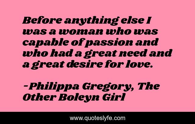 This page presents the quote "Before anything else I was a woman who was capable of passion and who had a great need and a great desire for love.". Author of this quote is Philippa Gregory, The Other Boleyn Girl. This quote is about henry-viii, anne-boleyn, historical-fiction,.