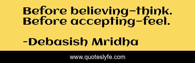 This page presents the quote "Before believing—think. Before accepting—feel.". Author of this quote is Debasish Mridha. This quote is about miraboli, oscar-wilde, feel, philosophy, debasish-mridha, debasish-mridha-md, quotes, gandhi, inspirational,.