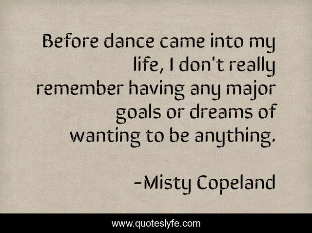 This page presents the quote "Before dance came into my life, I don't really remember having any major goals or dreams of wanting to be anything.". Author of this quote is Misty Copeland. This quote is about dance, life, goals,.