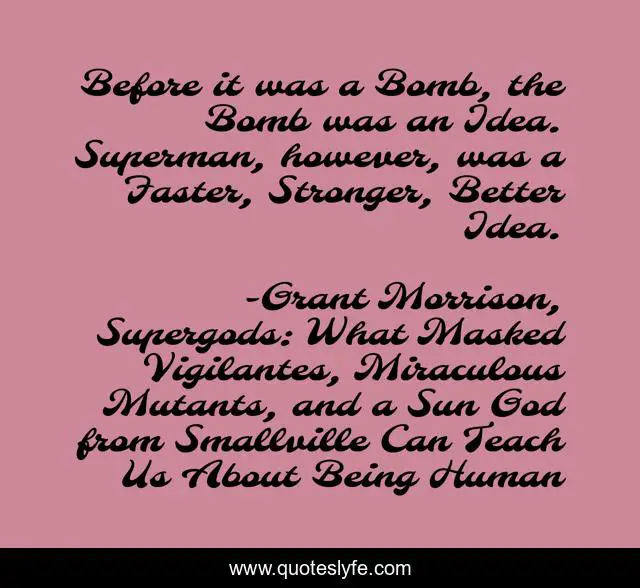 This page presents the quote "Before it was a Bomb, the Bomb was an Idea. Superman, however, was a Faster, Stronger, Better Idea.". Author of this quote is Grant Morrison, Supergods: What Masked Vigilantes, Miraculous Mutants, and a Sun God from Smallville Can Teach Us About Being Human. This quote is about ideas, superman,.