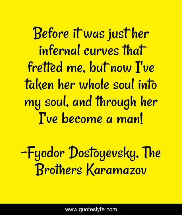 This page presents the quote "Before it was just her infernal curves that fretted me, but now I've taken her whole soul into my soul, and through her I've become a man!". Author of this quote is Fyodor Dostoyevsky, The Brothers Karamazov. .