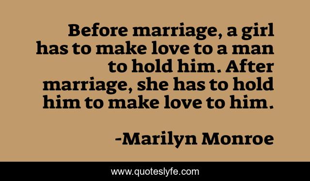 This page presents the quote "Before marriage, a girl has to make love to a man to hold him. After marriage, she has to hold him to make love to him.". Author of this quote is Marilyn Monroe. This quote is about girl, love, affection, man,.