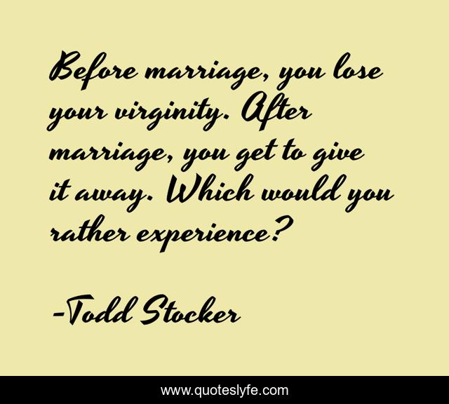 This page presents the quote "Before marriage, you lose your virginity. After marriage, you get to give it away. Which would you rather experience?". Author of this quote is Todd Stocker. This quote is about virginity, confidence, positive, motivational, experience, marriage, optimistic, inspirational, enthusiasm,.