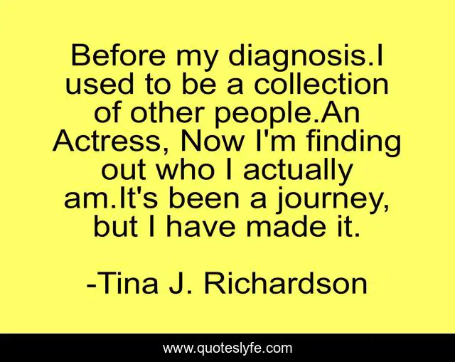 This page presents the quote "Before my diagnosis.I used to be a collection of other people.An Actress, Now I'm finding out who I actually am.It's been a journey, but I have made it.". Author of this quote is Tina J. Richardson. This quote is about woman, aspergers,.