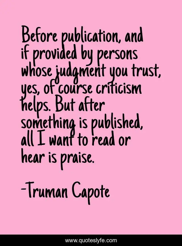 This page presents the quote "Before publication, and if provided by persons whose judgment you trust, yes, of course criticism helps. But after something is published, all I want to read or hear is praise.". Author of this quote is Truman Capote. This quote is about criticism, writing,.