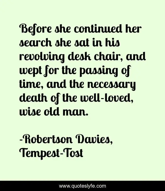 This page presents the quote "Before she continued her search she sat in his revolving desk chair, and wept for the passing of time, and the necessary death of the well-loved, wise old man.". Author of this quote is Robertson Davies, Tempest-Tost. This quote is about death, love, affection, time,.
