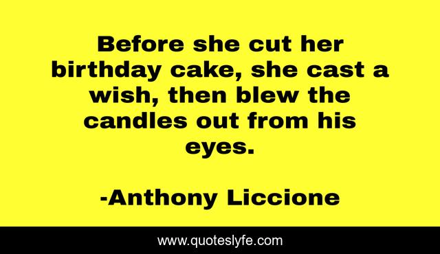 This page presents the quote "Before she cut her birthday cake, she cast a wish, then blew the candles out from his eyes.". Author of this quote is Anthony Liccione. This quote is about blow, breath, cut, end, darkness, candles, last-wish, remove, leave,.
