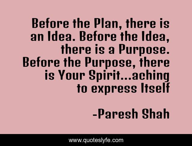 This page presents the quote "Before the Plan, there is an Idea. Before the Idea, there is a Purpose. Before the Purpose, there is Your Spirit...aching to express Itself". Author of this quote is Paresh Shah. This quote is about spiritual, self-expression, be-yourself, ideas, follow-your-dreams, purpose, inspiration,.