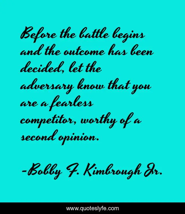 This page presents the quote "Before the battle begins and the outcome has been decided, let the adversary know that you are a fearless competitor, worthy of a second opinion.". Author of this quote is Bobby F. Kimbrough Jr.. This quote is about battle, competition, encouragement,.