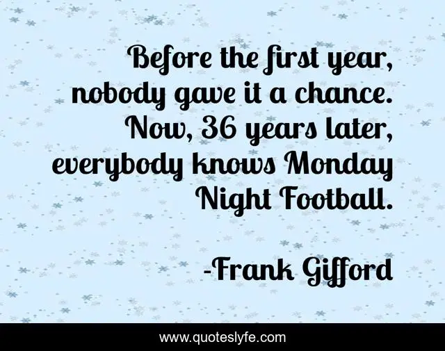 This page presents the quote "Before the first year, nobody gave it a chance. Now, 36 years later, everybody knows Monday Night Football.". Author of this quote is Frank Gifford. This quote is about football, monday, night,.