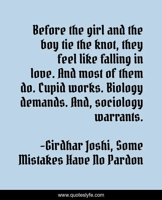 This page presents the quote "Before the girl and the boy tie the knot, they feel like falling in love. And most of them do. Cupid works. Biology demands. And, sociology warrants.". Author of this quote is Girdhar Joshi, Some Mistakes Have No Pardon. This quote is about biology, love, cupid, affection,.