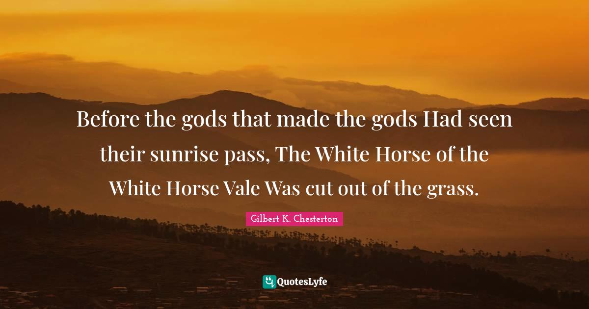 This page presents the quote "Before the gods that made the gods Had seen their sunrise pass, The White Horse of the White Horse Vale Was cut out of the grass.". Author of this quote is Gilbert K. Chesterton. This quote is about sunrise, white, grass, white horse, horse, made, cutting,.