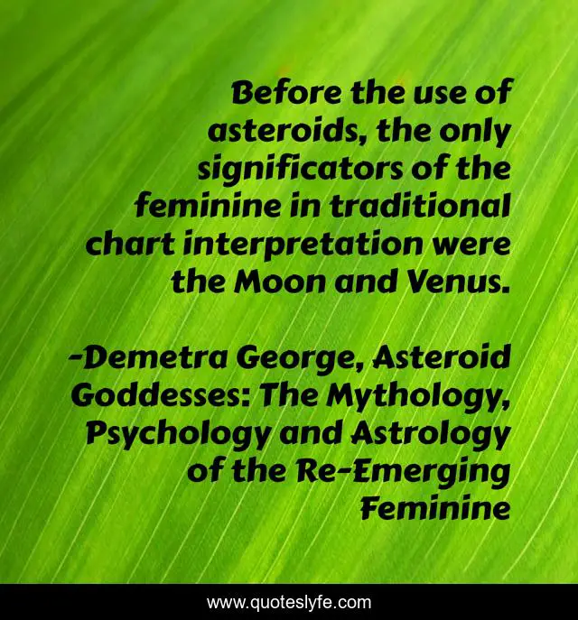 This page presents the quote "Before the use of asteroids, the only significators of the feminine in traditional chart interpretation were the Moon and Venus.". Author of this quote is Demetra George, Asteroid Goddesses: The Mythology, Psychology and Astrology of the Re-Emerging Feminine. This quote is about feminine, venus, astrology, moon,.