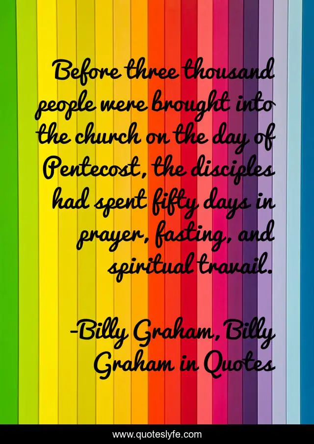 This page presents the quote "Before three thousand people were brought into the church on the day of Pentecost, the disciples had spent fifty days in prayer, fasting, and spiritual travail.". Author of this quote is Billy Graham, Billy Graham in Quotes. This quote is about billy-graham, church,.