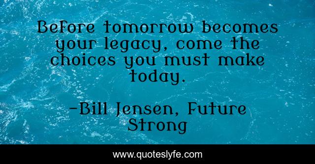 This page presents the quote "Before tomorrow becomes your legacy, come the choices you must make today.". Author of this quote is Bill Jensen, Future Strong. This quote is about enthusiasm, future, leadership, inspirational, self-help,.