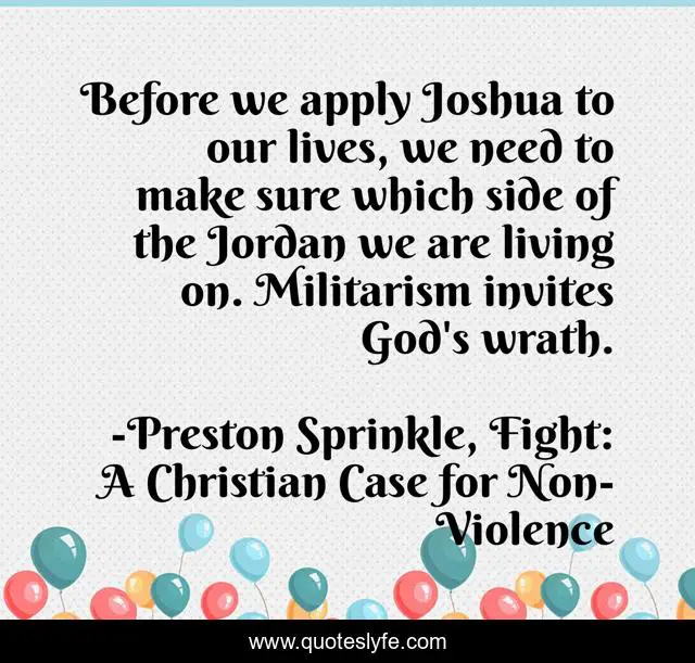 This page presents the quote "Before we apply Joshua to our lives, we need to make sure which side of the Jordan we are living on. Militarism invites God's wrath.". Author of this quote is Preston Sprinkle, Fight: A Christian Case for Non-Violence. This quote is about nonviolence, bible, war, theology,.