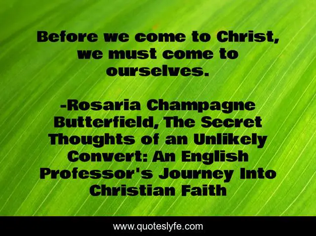 This page presents the quote "Before we come to Christ, we must come to ourselves.". Author of this quote is Rosaria Champagne Butterfield, The Secret Thoughts of an Unlikely Convert: An English Professor's Journey Into Christian Faith. This quote is about introspection, repentance, self-awareness, depravity,.