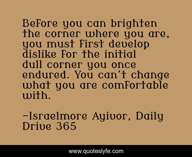 This page presents the quote "Before you can brighten the corner where you are, you must first develop dislike for the initial dull corner you once endured. You can’t change what you are comfortable with.". Author of this quote is Israelmore Ayivor, Daily Drive 365. This quote is about make-a-change, food-for-thought, comfort, develop, work-hard, hard-work, initial, comfortable, greener-pastures,.