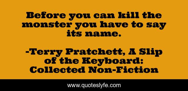This page presents the quote "Before you can kill the monster you have to say its name.". Author of this quote is Terry Pratchett, A Slip of the Keyboard: Collected Non-Fiction. .