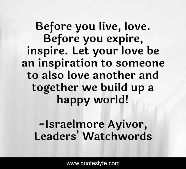This page presents the quote "Before you live, love. Before you expire, inspire. Let your love be an inspiration to someone to also love another and together we build up a happy world!". Author of this quote is Israelmore Ayivor, Leaders' Watchwords. This quote is about motivation, inspirations, love, inspire, share, i-love-you, true-love, food-for-thought, motivate,.