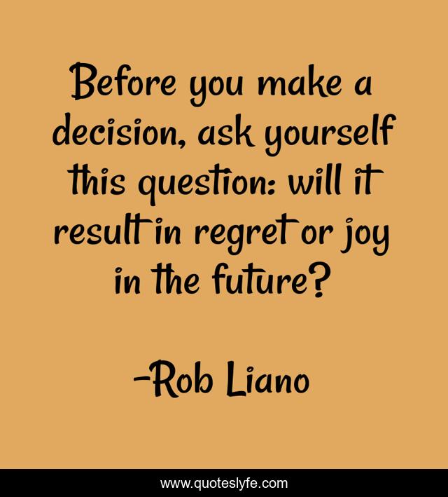 This page presents the quote "Before you make a decision, ask yourself this question: will it result in regret or joy in the future?". Author of this quote is Rob Liano. This quote is about future-plans, rejoice, regret, results, accountability, personal-development, decisions, inspiration,.
