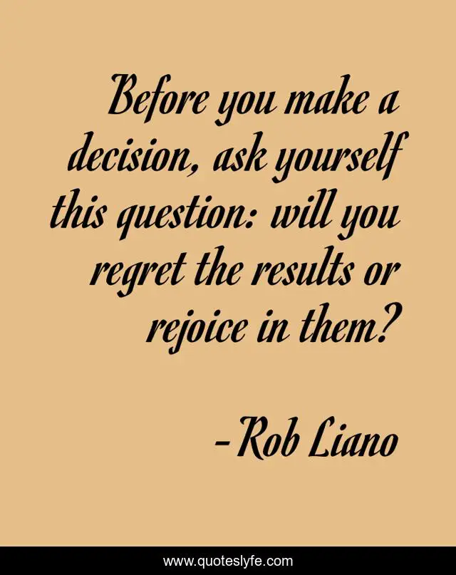 This page presents the quote "Before you make a decision, ask yourself this question: will you regret the results or rejoice in them?". Author of this quote is Rob Liano. This quote is about desire, future-plans, rejoice, regret, responsivility, results, choices, impulsiveness, life-decisions,.