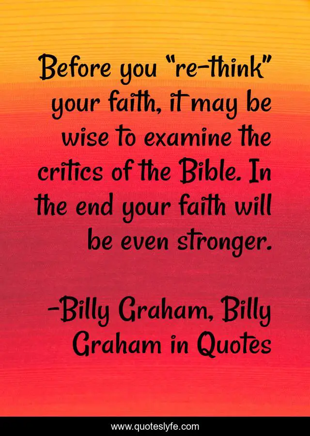 This page presents the quote "Before you “re-think” your faith, it may be wise to examine the critics of the Bible. In the end your faith will be even stronger.". Author of this quote is Billy Graham, Billy Graham in Quotes. This quote is about bible, billy-graham,.