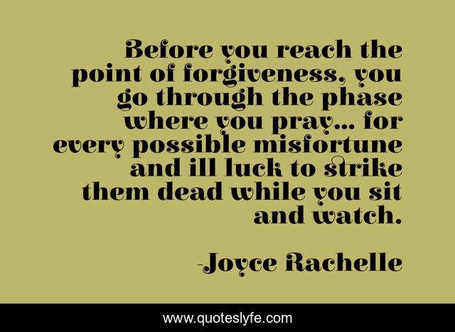 This page presents the quote "Before you reach the point of forgiveness, you go through the phase where you pray... for every possible misfortune and ill luck to strike them dead while you sit and watch.". Author of this quote is Joyce Rachelle. This quote is about forgiving-and-forgetting, anger-management, letting-go, forgiveness, forgive-and-let-go, revenge, abuse, toxic-people, forgive-and-forget,.
