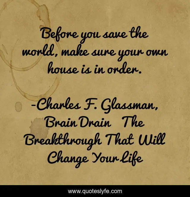 This page presents the quote "Before you save the world, make sure your own house is in order.". Author of this quote is Charles F. Glassman, Brain Drain The Breakthrough That Will Change Your Life. This quote is about confidence, positive, motivational, tough-love, optimistic, inspirational, self-help, enthusiasm,.